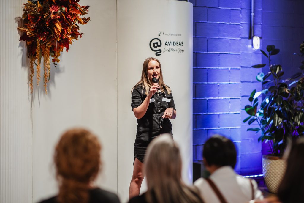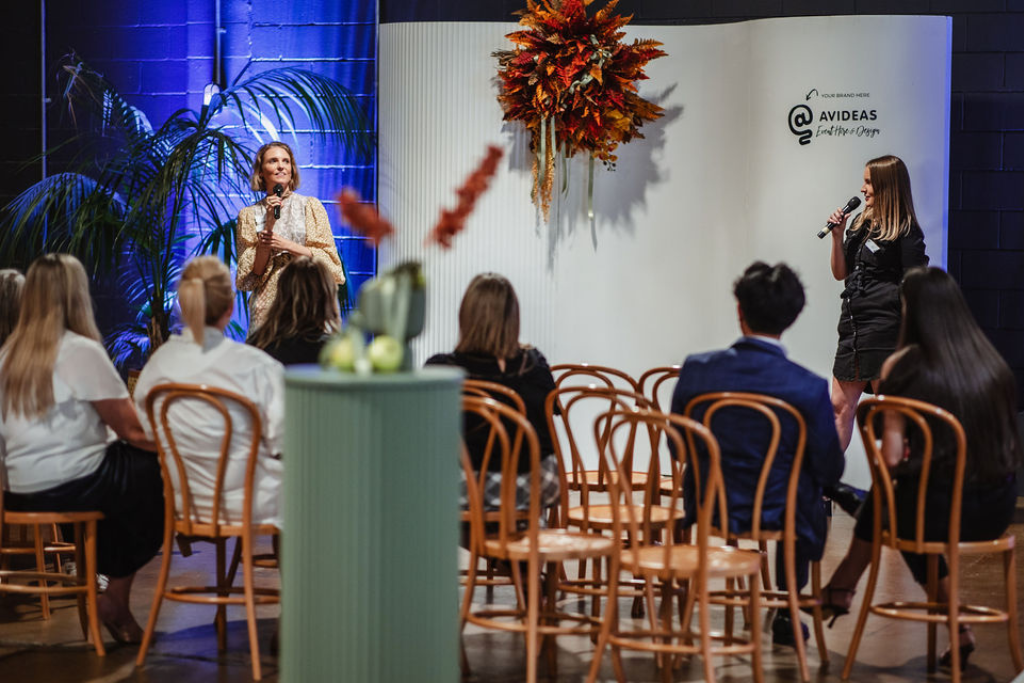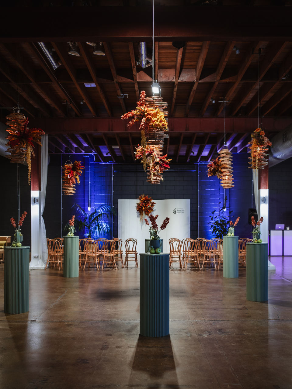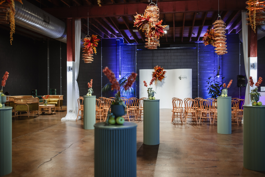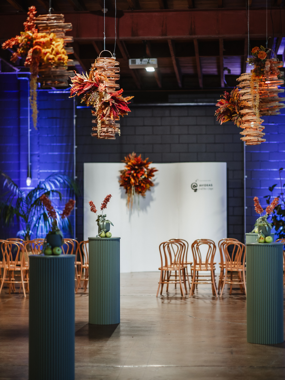 We styled the venue with an autumnal palette that tied in beautifully with the March timing, creating warmth and richness throughout the space. Faux florals and textured hanging installations transformed the ceiling, adding height and visual interest. A custom backdrop reading “Your Brand Here” was designed to demonstrate how the space could be activated for future events, sparking inspiration for attendees.