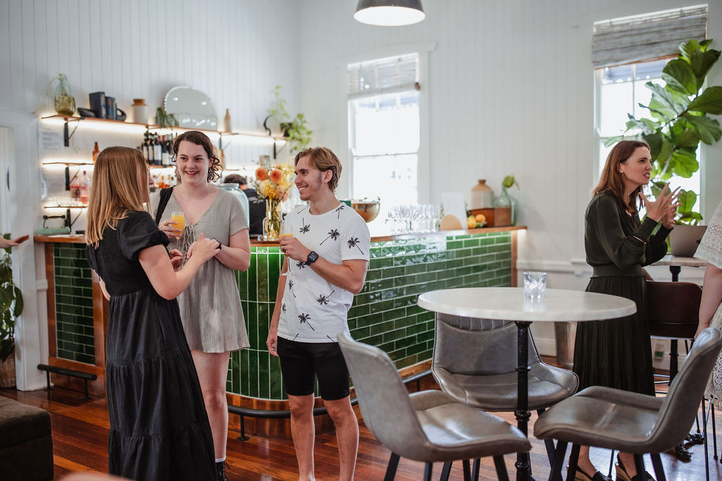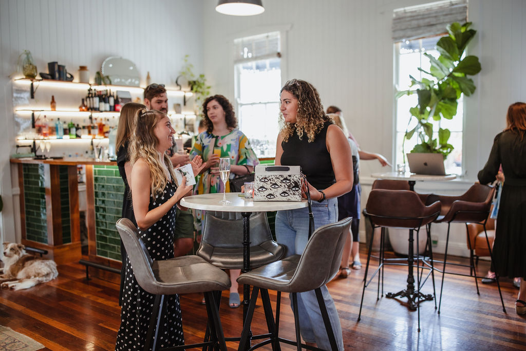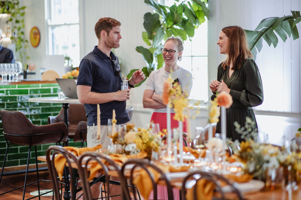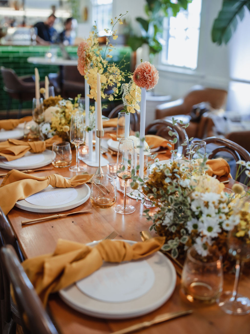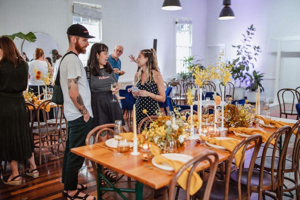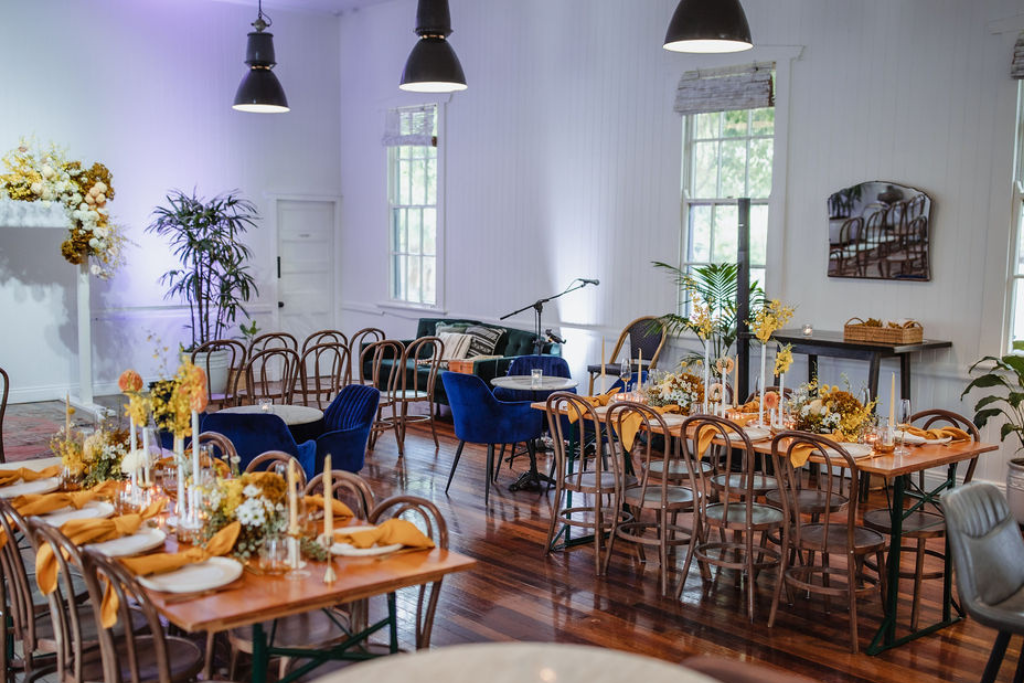 This morning meet-and-greet event featured soft live music from a soloist to set a calm and welcoming tone. We leaned into a brunch-style layout with a beautifully curated grazing board and full styling throughout the space. Our colour palette brought together cheerful yellows with contrasting blue furniture – pulling from the venue’s existing tan tones to create something fresh and different.
